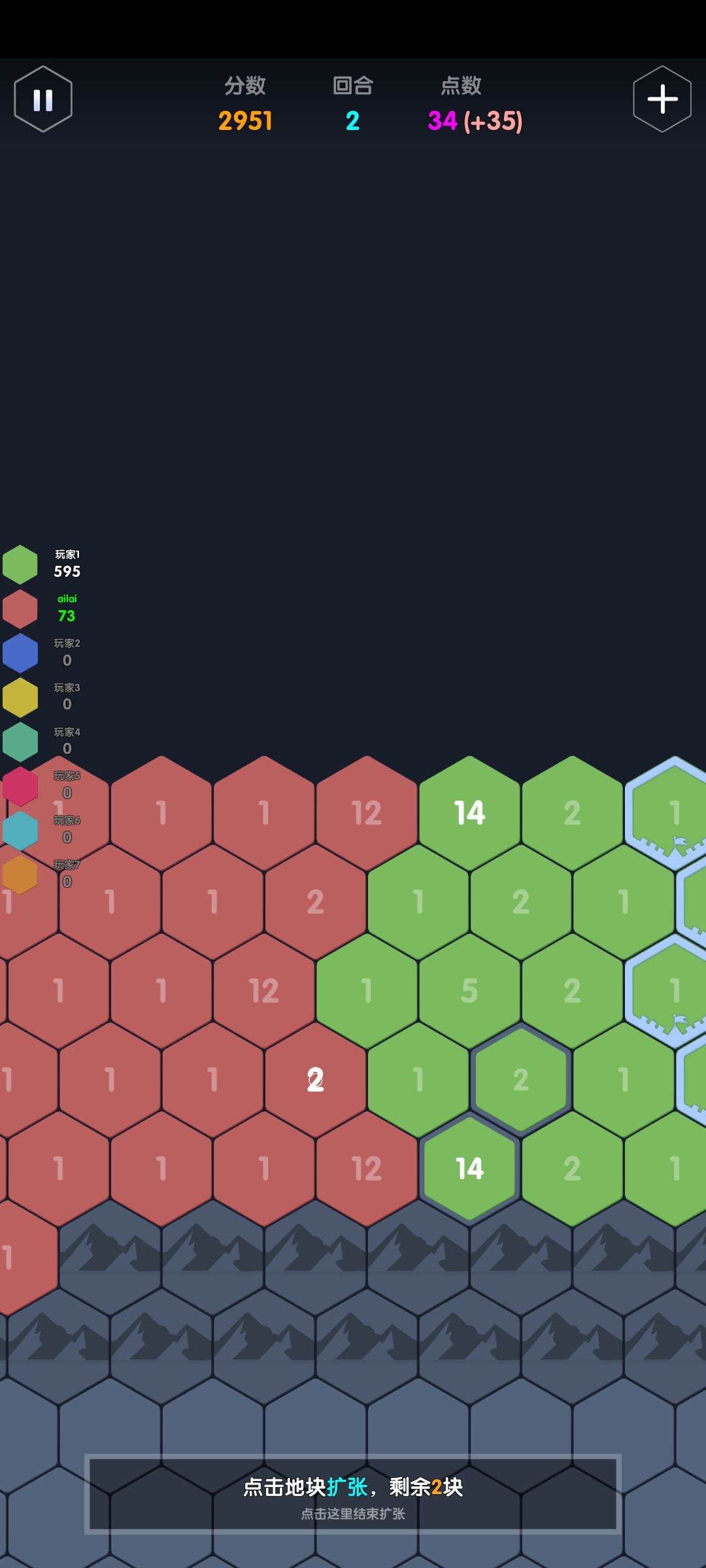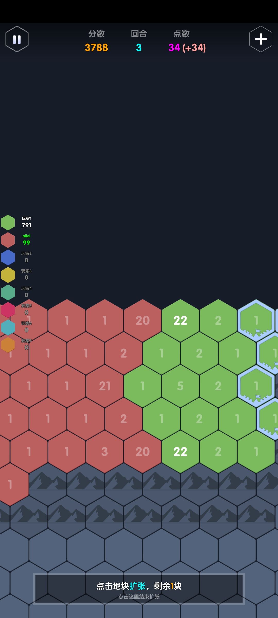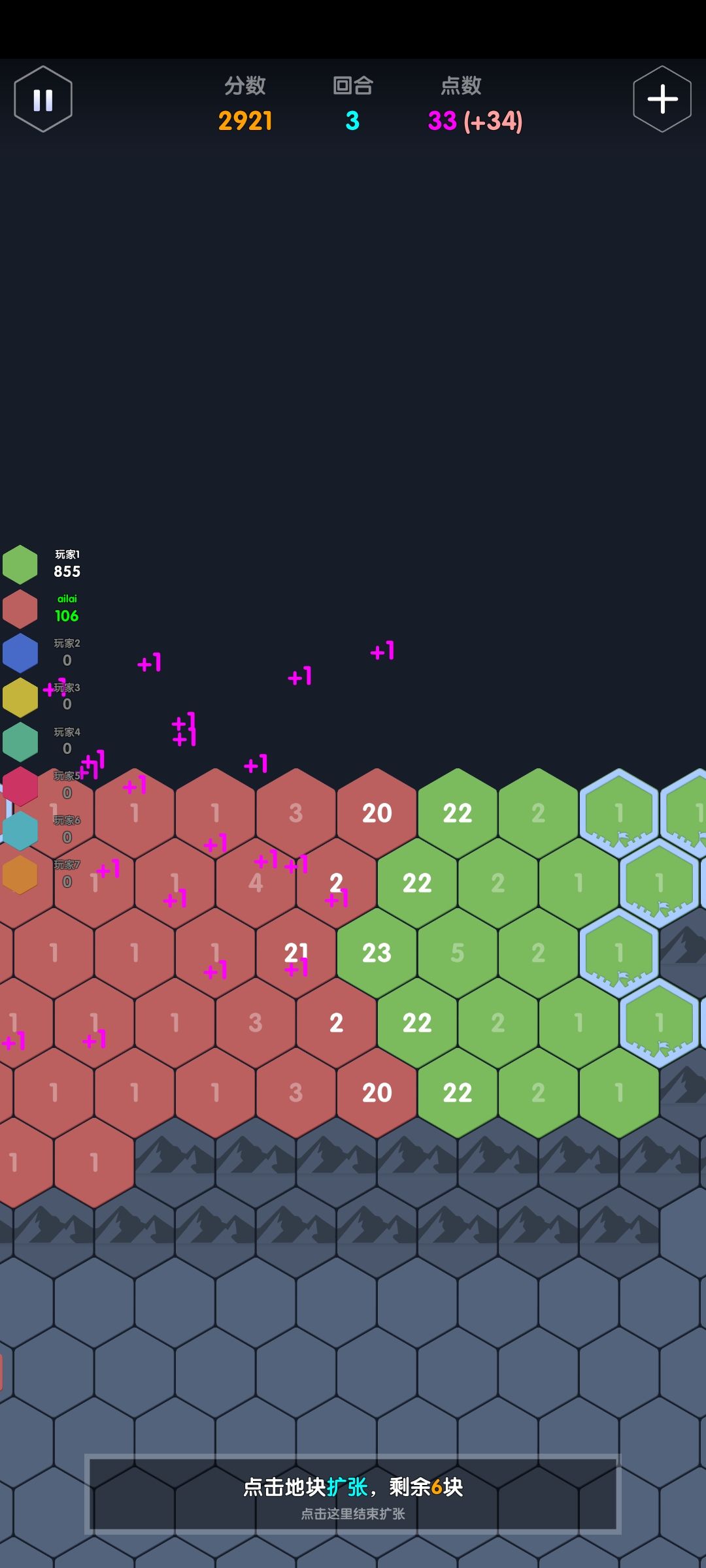 举例:一个点数充足的ai,接壤了点数分别为3,4,5的地块,那它会加到几?答案是这三格的合击+1:2+3+4+1=10