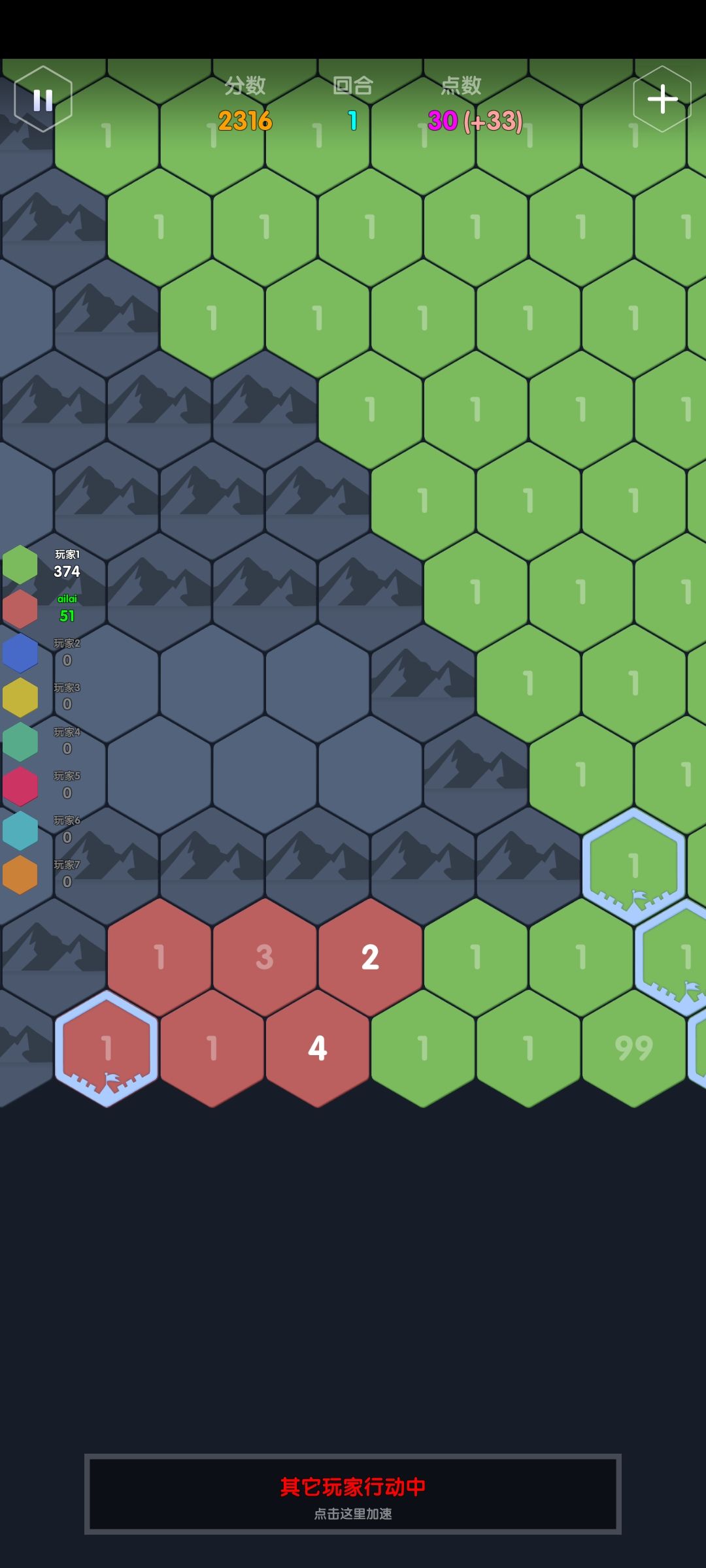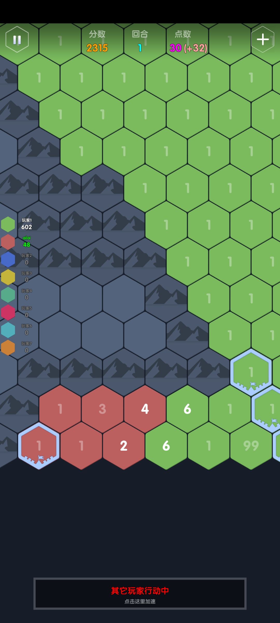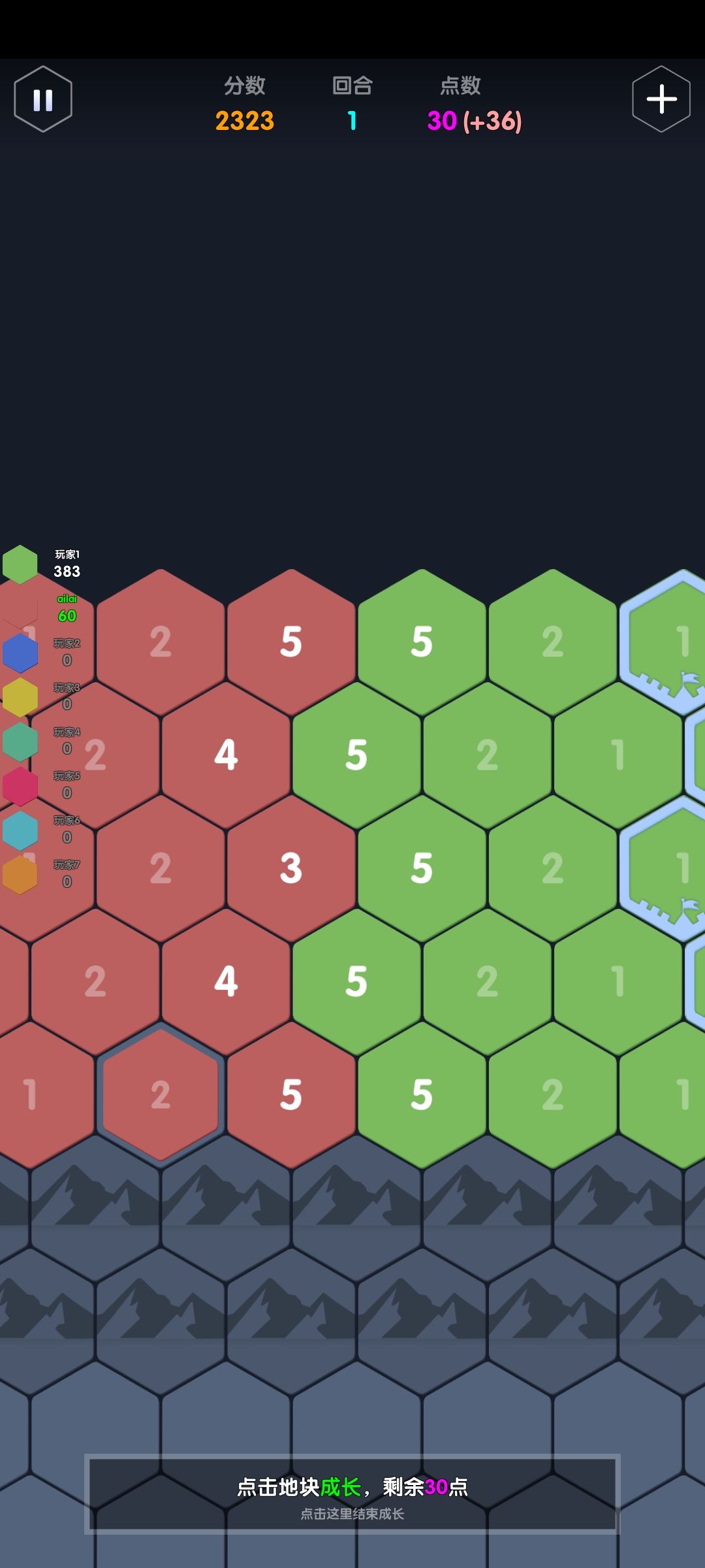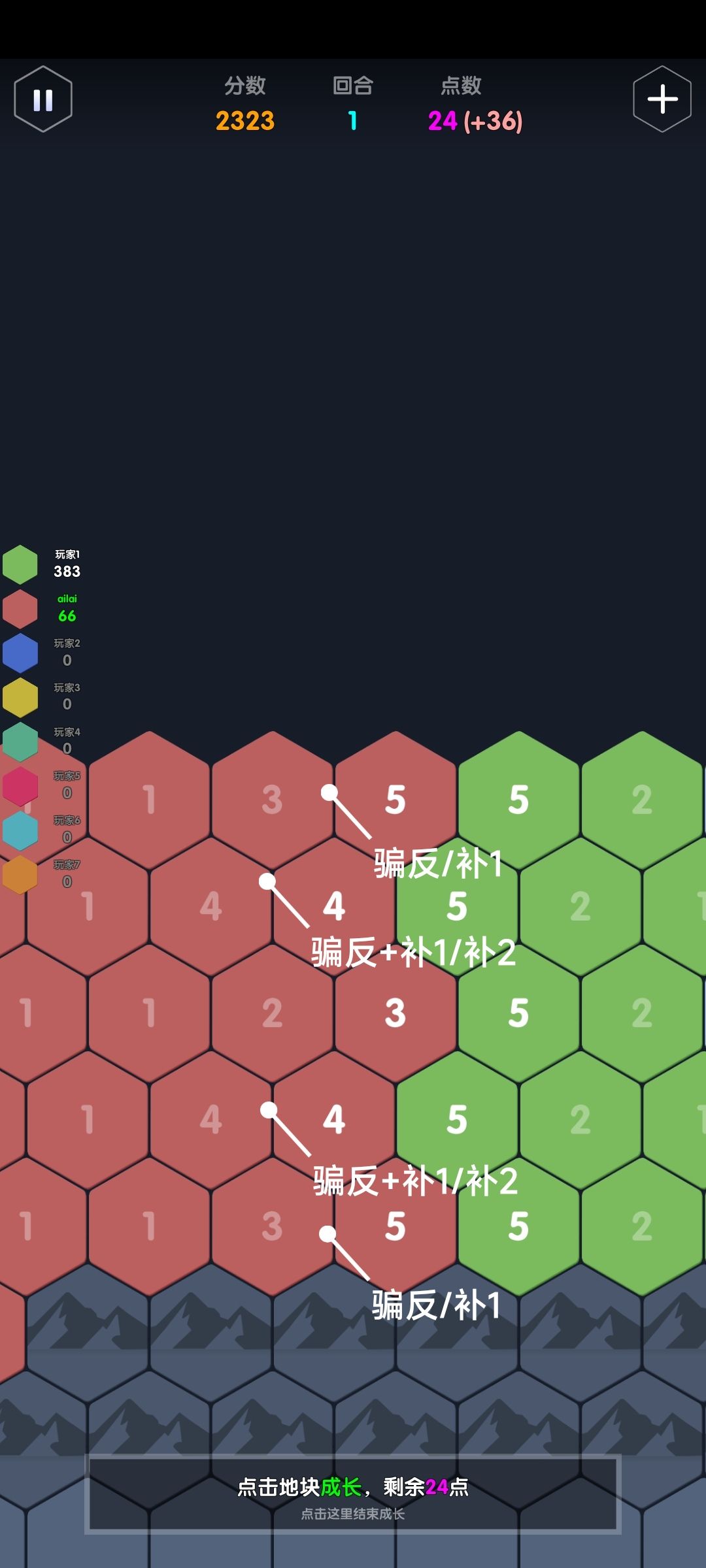 举例:一个点数充足的ai,接壤了点数分别为3,4,5的地块,那它会加到几?答案是这三格的合击+1:2+3+4+1=10