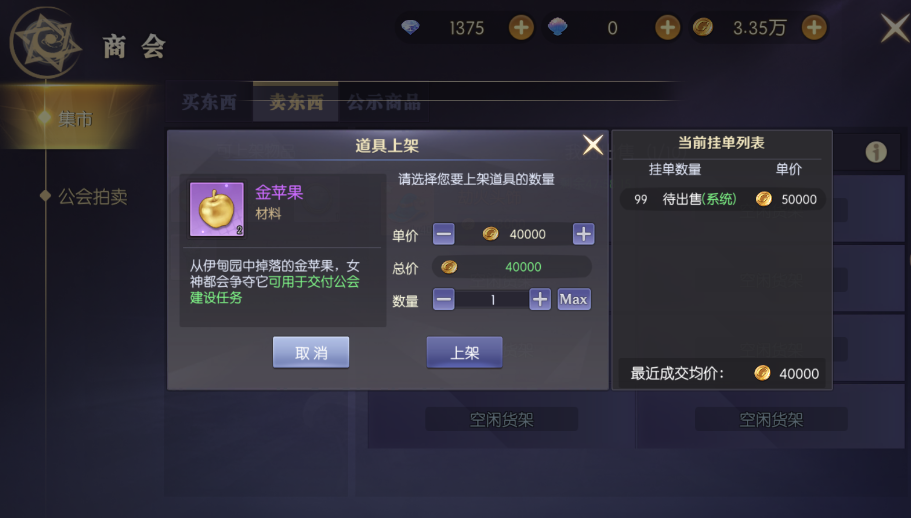 如果想要出售道具,则点击卖东西,此时会显示我们背包中所有可以上架的物品,选中之后输入要出售的单价数量就能点击上架了。如果不知道对应价格也没有关系,系统会给出建议价格,同时也会显示该道具近期交易的平均价格,只要根据这些资料合理进行定价就可以了。需要注意的是,能够上架的道具都是一些非绑定的物品,如果穿戴后已经绑定则无法在此出售。