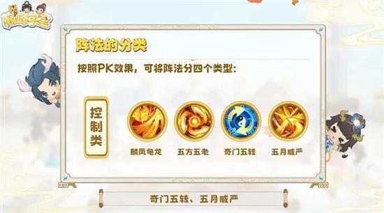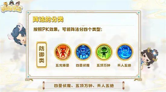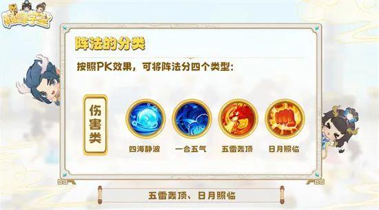 首先,我们先来看看阵法都有哪些类型。按照PK效果,可将阵法分四个类型:伤害类、控制类、辅助类、防御类
