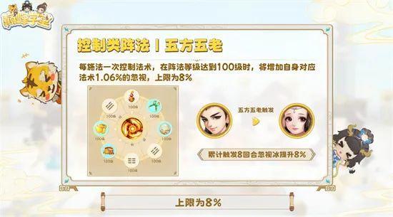 逆运五行的阵法由兑、坤、震、坎、艮五个阵位组成。在阵法等级达到100级时,可提升自身召唤兽5%的速度。