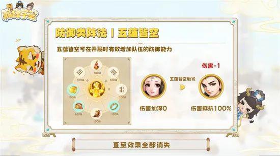 在防御类阵法中较常用的是五蕴皆空,五蕴皆空的阵法是由乾、坤、震、离、艮五个阵位组成。五蕴皆空可在开局时有效增加队伍的防御能力,当阵法等级达到100级时,进入战斗后可叠加100%的伤害抵抗,每受到一次伤害,伤害抵抗效果降低10%,直至效果全部消失