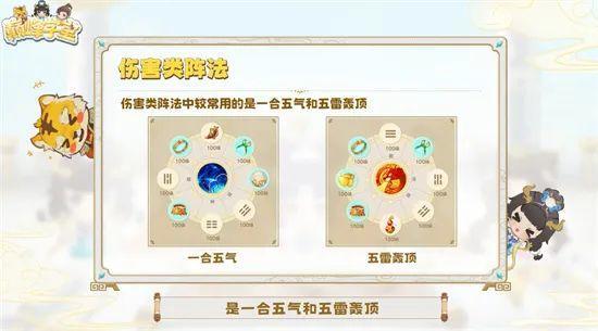 阵法的类型有很多,每个阵法的作用也各不相同。现在珠儿来给大家讲讲,一些常用的阵法和使用技巧。其中,在伤害类阵法中较常用的是一合五气和五雷轰顶。