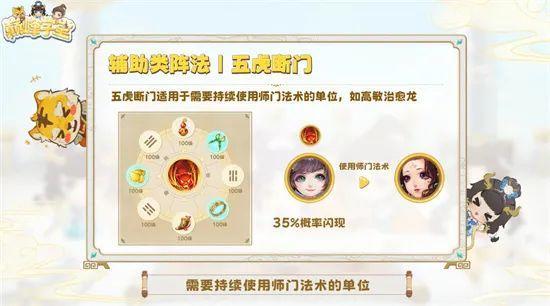 五虎断门的阵法是由乾、坤、离、巽、艮五个阵法组成。携带后,若自身召唤兽已离场,且阵法等级达到100级,则施法成功时有35%概率触发支援列表召唤兽闪现。因此五虎断门更适用于需要持续使用师门法术的单位,如高敏治愈龙。