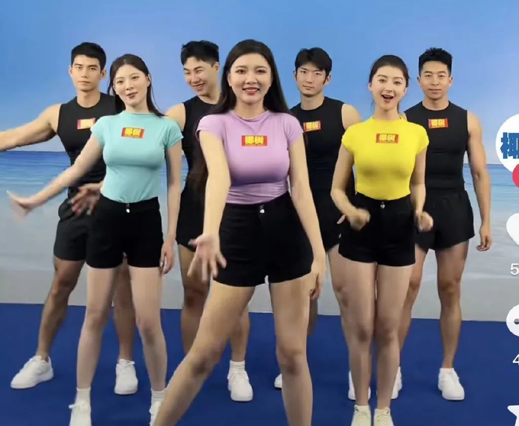 但你还真不能说椰树不懂“擦边”,基本款的热辣舞蹈人家那可是信手拈来,制服也都一套一套的,就连找来的帅哥美女放在演艺圈也算得上有点姿色。