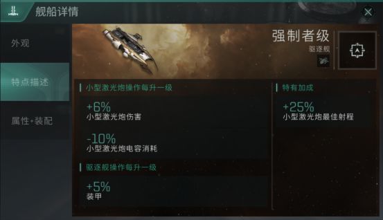 以a族强制者为例,舰船加成决定了这艘舰船是以激光炮为武器,防御方面为甲抗。