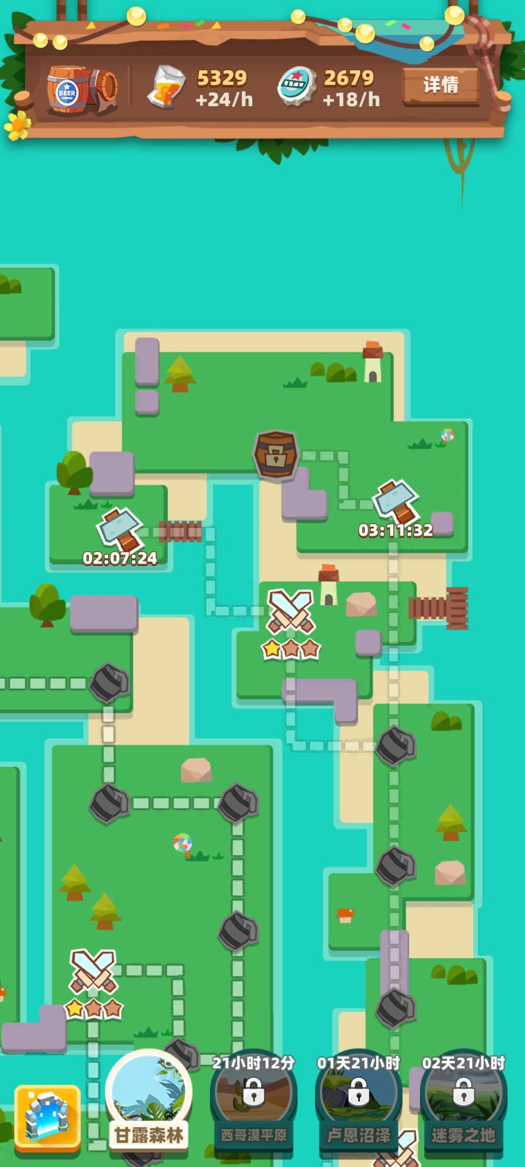 现在来说说探索地图应该怎么效率最大化。因为探索地图和地下城类似经常需要玩家派遣勇者,派遣需要花时间几小时到几十分钟不等。所以加速劵成了本次活动的关键。一张加速劵可以加速十分钟,不足十分钟按照十分钟计算(例如29分钟完成的探险和21分钟完成的探险一样要花3张加速劵)。为啥要用加速劵呢?因为早点拿到图二中的这些收藏品,可以对你的啤酒和积分有个每小时增长的加成啊。早点拿到就早吃奖励啊。我生产加速劵的勇者直接换成野猪了40分钟一张。然后探索中遇到的战斗关卡打完一关就请直接探索后面的。优先把地图探索开,之后实在被派遣卡住了再回头打关卡也不迟。