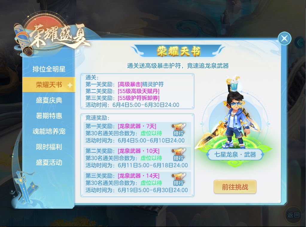 1)活动时间:荣耀盛夏服务器将于6月4日5:00至6月30日24:00开启荣耀天书活动;