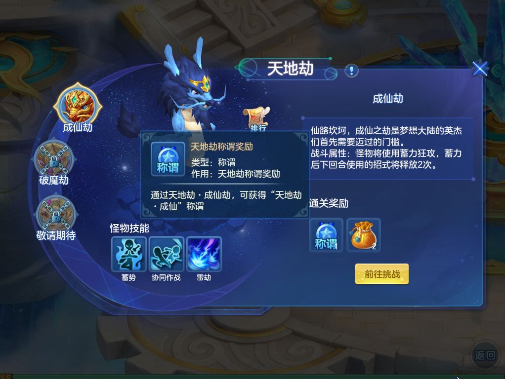 服务器等级飞升105级时将开启天地劫闯关高难挑战玩法,飞升110级玩家可以前往老江湖处进行挑战,每日失败5次后将无法挑战,通过挑战可以获得相关称谓奖励 。