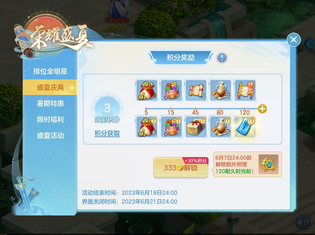 1)盛夏庆典:6月1日维护后-6月21日24:00,完成任务可获取积分领取奖励;
