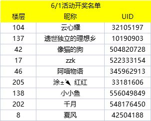 通过随机数的抽取,恭喜以下冒险者获取本次六一大礼包,请在七个工作日内联系官方客服(QQ800181136)提供您的信息。