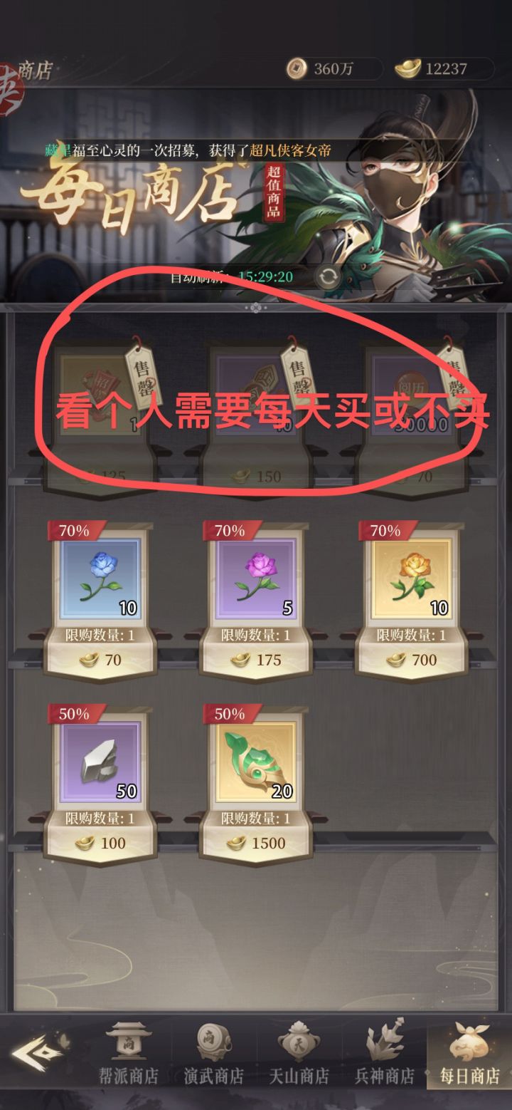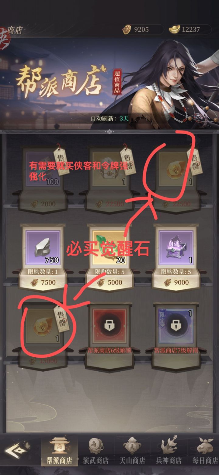 帮派商店必买觉醒,一周两个觉醒,要是帮贡多买侠客和令牌强化