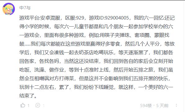 游戏平台(安卓混服/应用宝/果盘/IOS)+区服+游戏ID+我的六一回忆