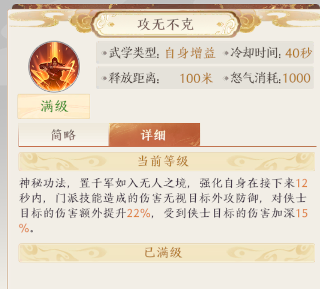说回大爆发,明教本身是有攻无不克和怒斩十七刀这两个技能的,攻无不克CD40秒,持续时间12秒,持续时间内释放门派技能无视目标外攻防御,对玩家单位额外造成22%伤害!提升很大,但也会额外遭受玩家单位15%的伤害。释放该技能后一旦被控被打一套爆发会非常痛,强烈建议攻无不克配合免控技能一起释放。