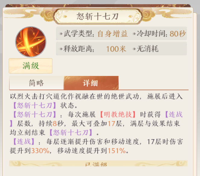 怒斩十七刀这技能更有意思,每次释放明教技能都会叠加该技能的BUFF,最高叠到17层,持续时间为8秒,层数越高移动速度和额外伤害提升越高,满层17层时可以达到330%伤害加成和151%移速加成。
