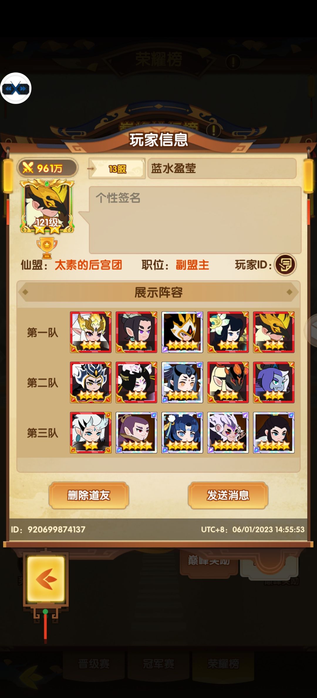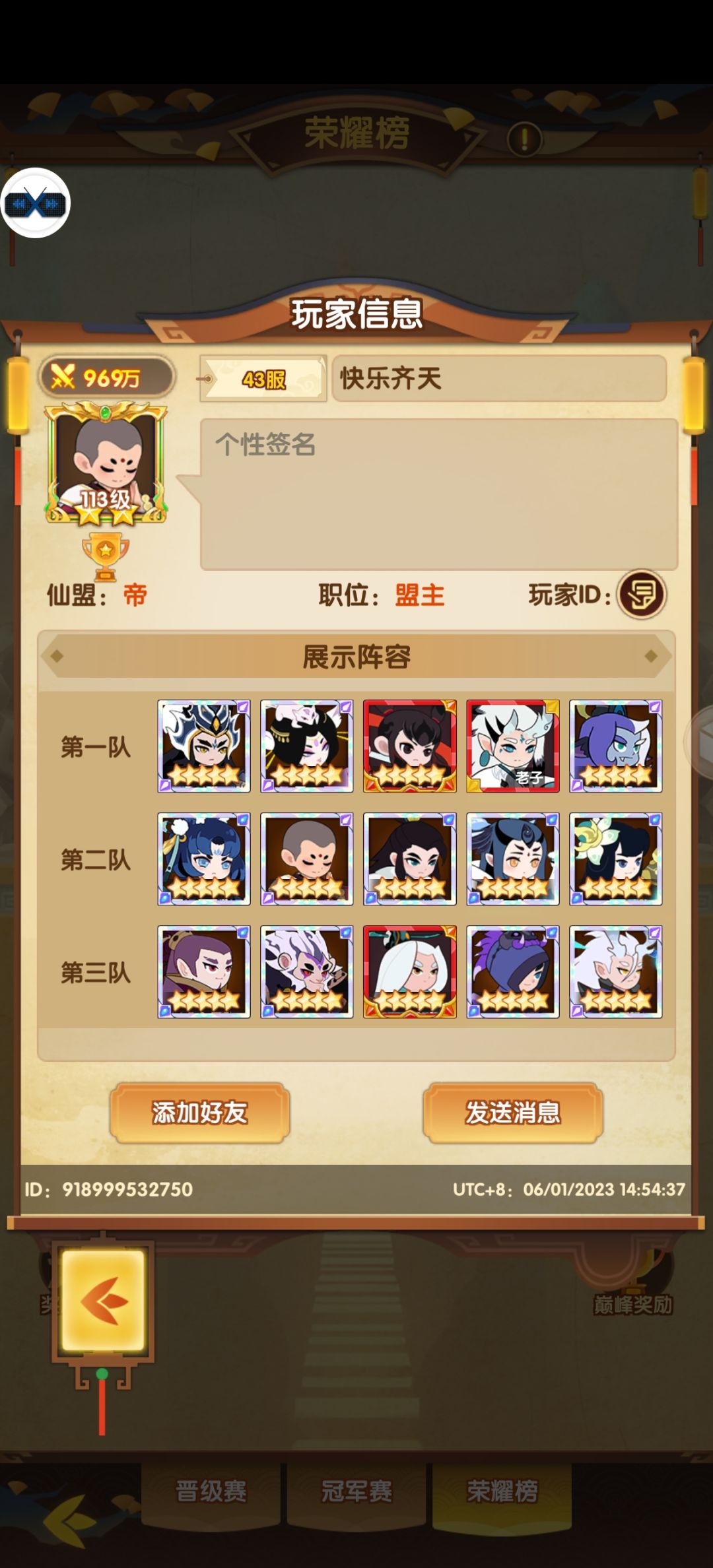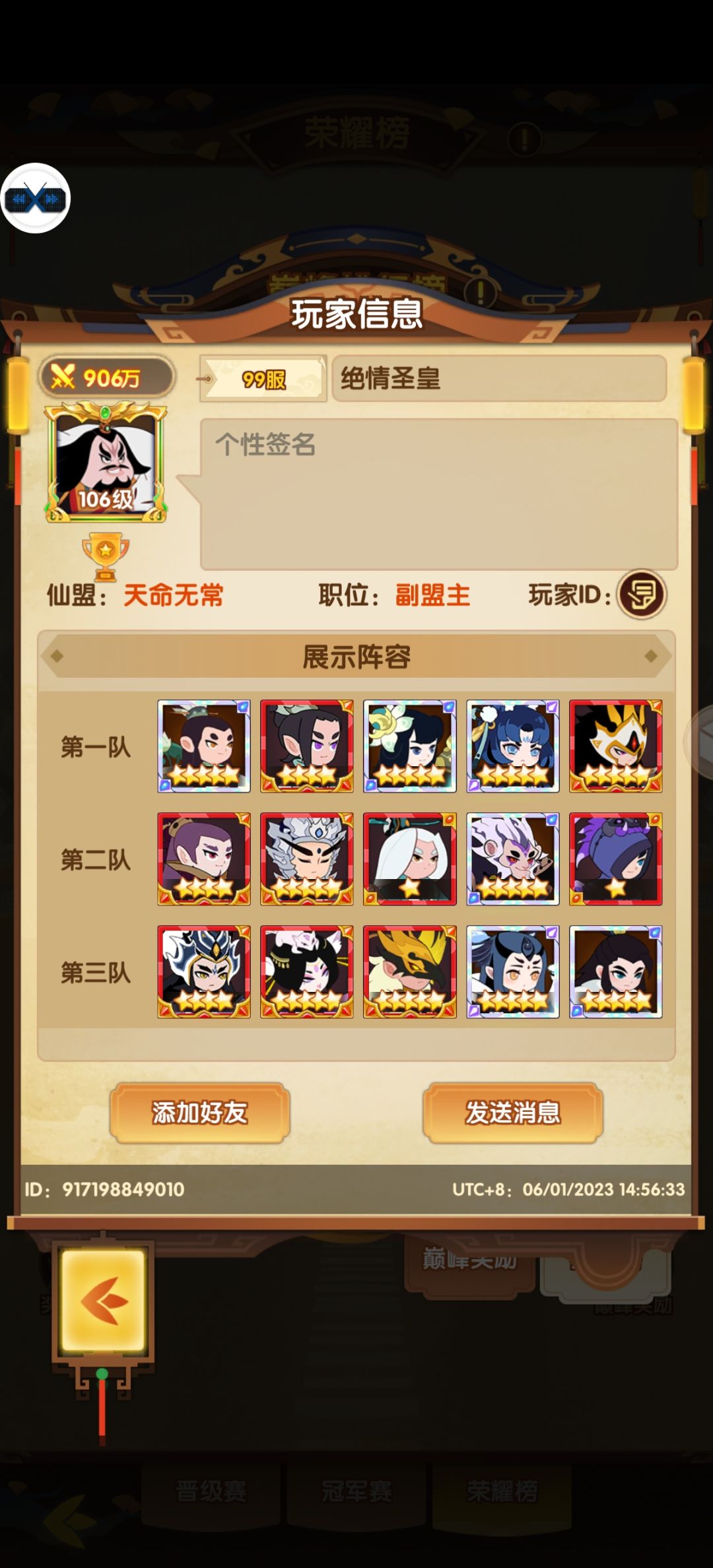 T1,未知而未知的最强准帝,用户63799532,来自49纪元的神秘准帝,没有人知道他是谁,他来自哪里,他只用自己准帝无敌一般的实力象征着自己的存在,是一神三帝之下的最强者,天资:氪之天尊,战力:983万,层次:准帝巅峰
