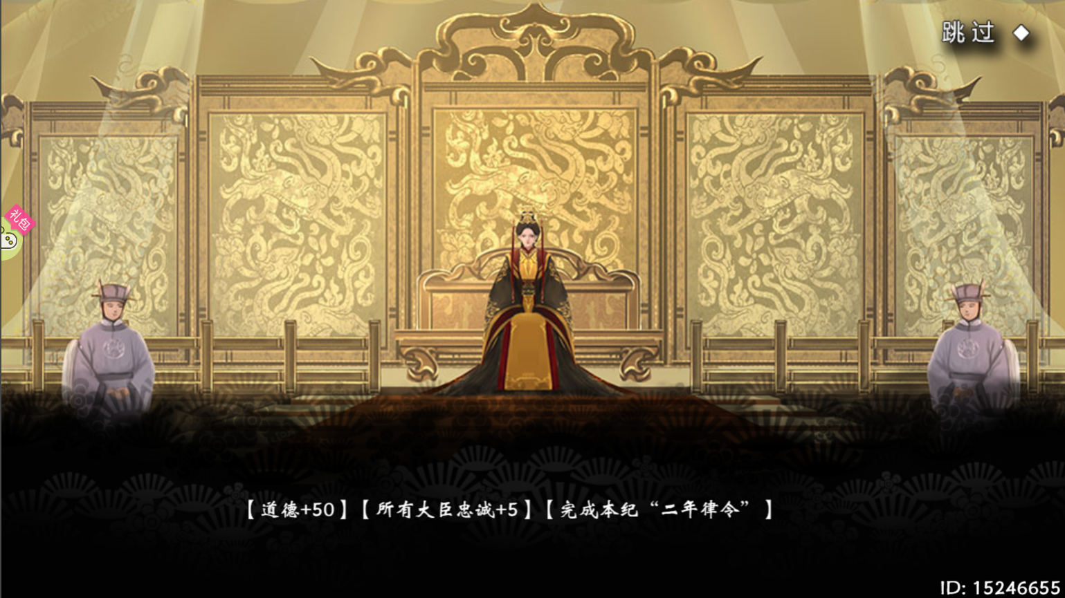 本纪四完成后,因为前期所有的操作都把属性刷够了,所以直接触发本纪五,觉醒临朝称制,剧情后就可以上朝了,记得不要跳过剧情,否则可能无法完成觉醒