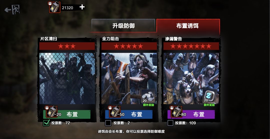 防御尸潮玩法通过消耗道具诱饵开启,在营地首领和官员正式开启前,所有成员可对难度进行投票,方便管理人员选择适合的难度。消耗诱饵越多难度越大,战斗胜利奖励也越丰厚,奖励分为个人奖励和工会奖励两种,同时获得。
