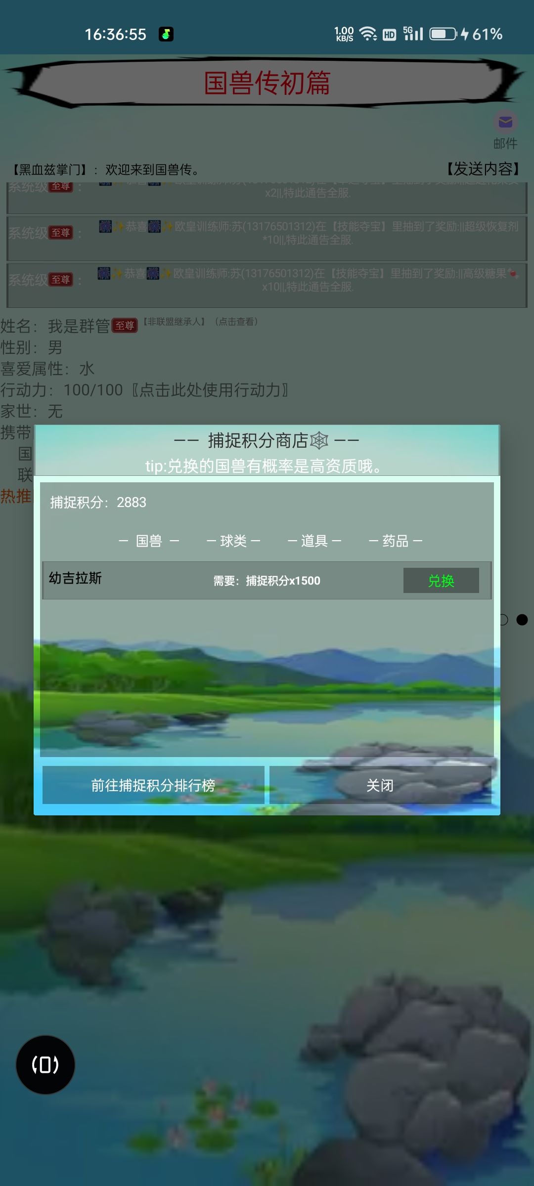 捕捉积分可以捕捉积分商店兑换国兽球、药品、球类、以及新国兽〖幼吉拉斯〗,