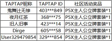 恭喜以上五位队长,获得P5X主人公立牌套装*1,请务必在3个工作日内加入官方QQ群,联系管理员提交社区ID、个人信息截图,以及中奖通知截图,我们将核实您的身份后,在30个工作日内寄出奖品。