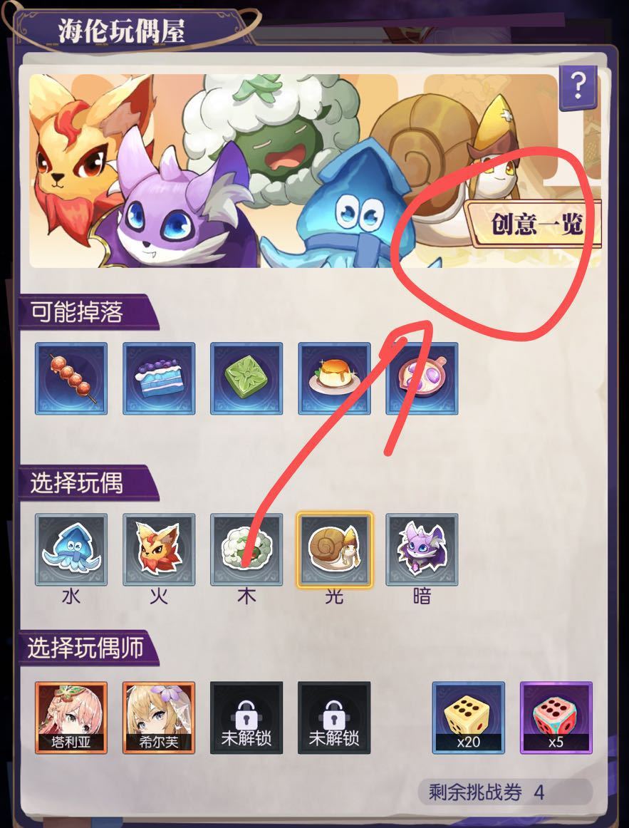 就快速到上图中蓝圈场景,选择跟玩偶师对应的属性核心,会根据核心等级加成属性,比如我是使用塔利亚和希尔芙两个玩偶师,我就立刻选择火焰核心,光明核心,场景攻击加成默认值是20,核心倍率是20%.总获得的属性值就是24,依此类推