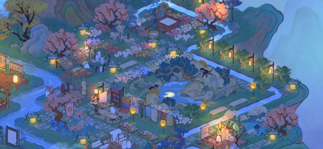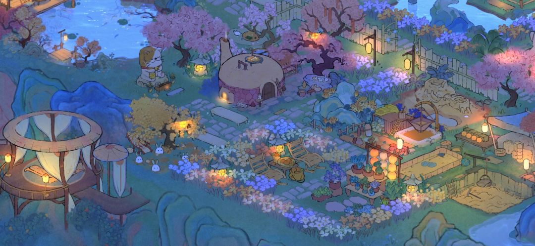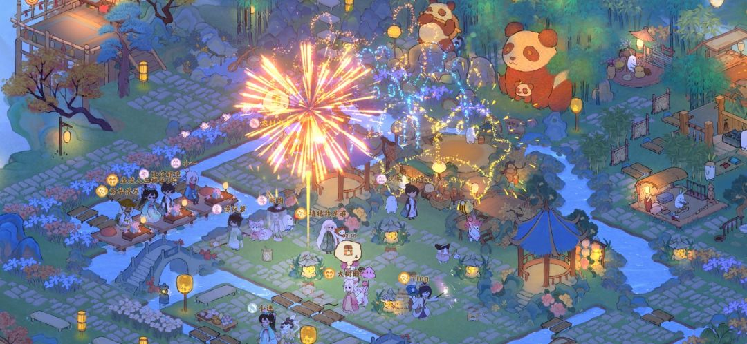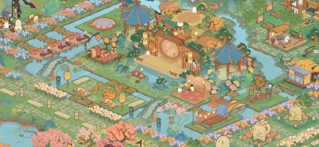 最喜欢岛二中间舞台大大的会客厅大气上档次有内涵,团建备份二大舞台和一些装饰建筑一收,铺上小地砖,团建放烟花时舒适性会高点~最重要是好看还好玩~鱼池旁是花花公园,主打一个粉粉美丽。