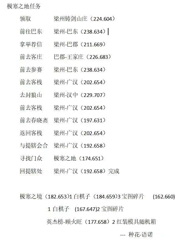 其他新增:梁州极寒之地170、655(江阳戏台附近),3个藏宝图碎片附上别处看到的极寒之地主线任务详细步骤