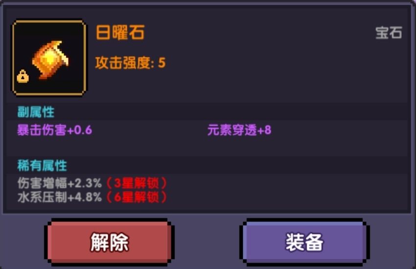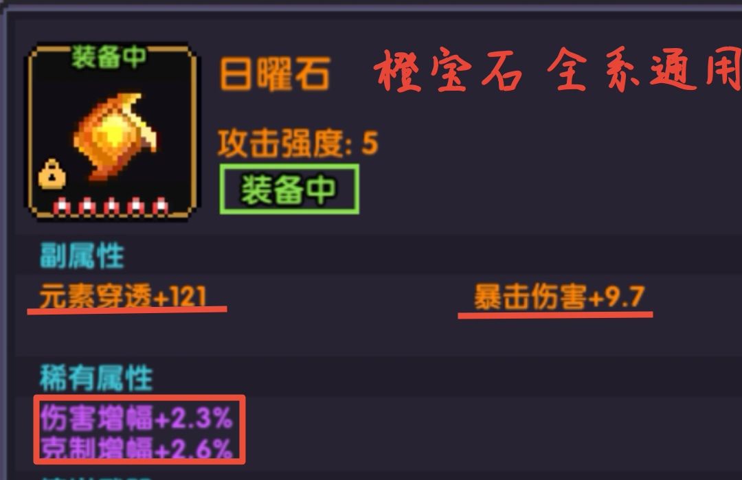 对于刚入手萌新,宝石提供非常重要的元素穿透!元素穿透!元素穿透!我们前期主要需要宝石的提供的元穿,其它的属性能用即可,不必强求