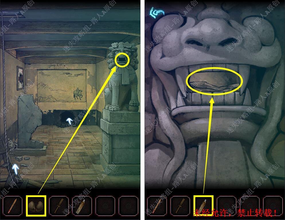 35.将【两半石球】放入石狮子的嘴里,再用【粘合剂】将嘴里的两半石球粘合完整。35.1