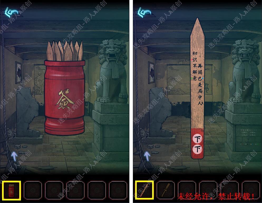 29.拾取【将军骑马图】和【签筒】,完成墙上的拼图,拉下铁环。29.1
