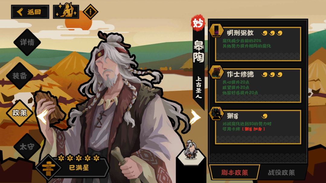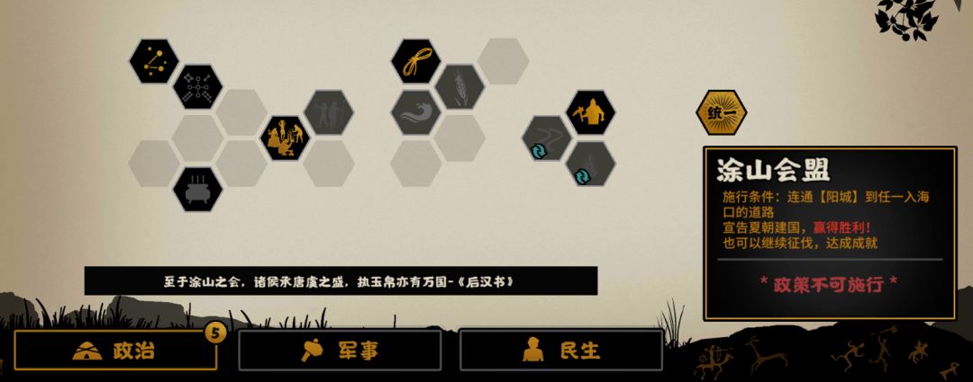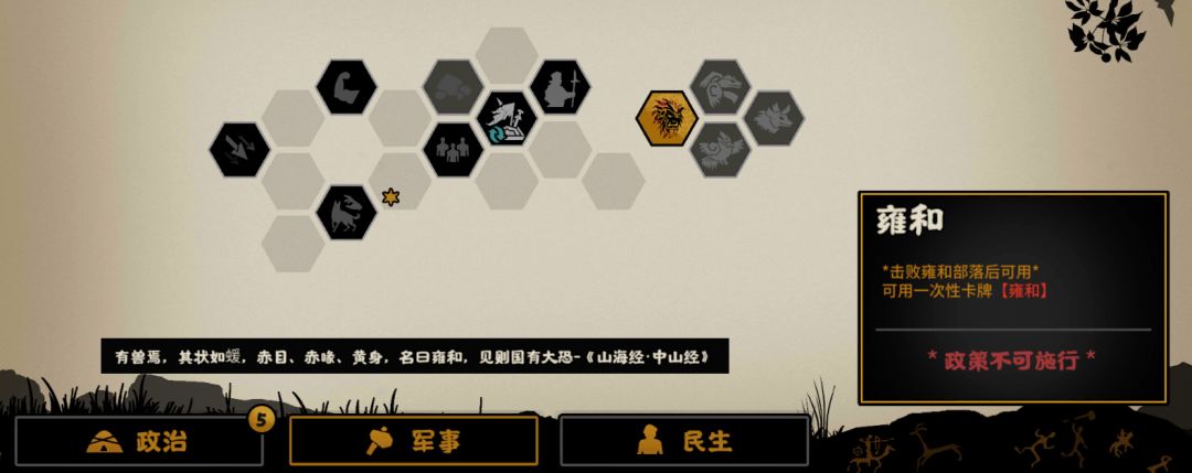 新剧本中也设置了时代特色政策——涂山会盟,需要连通入海口取得胜利(连通入海口是此次剧本胜利的必要条件)。剧本中还暗藏诸多危险,异兽、山泽自然都威胁着先民们的生命,但如果成功降伏凶兽,就可实施相应的政策获取荒兽卡牌。