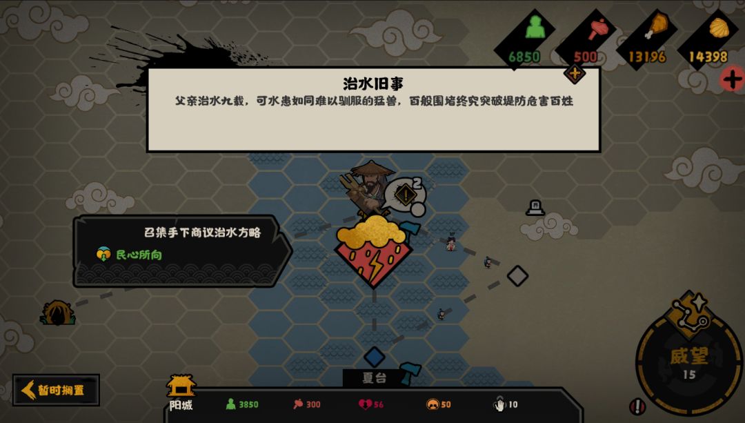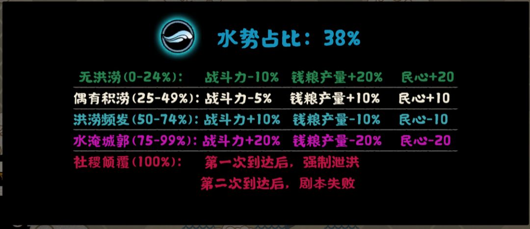 无洪涝、偶有积涝、洪涝频发、水淹城郭、社稷倾覆等五种状态,王上们需要时刻注意水势的动向,不可疏忽大意哦~