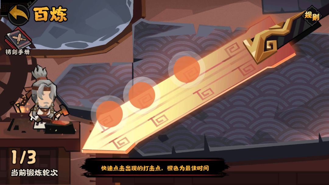 百炼:反复锻打粗铁料,去除杂质,并让剑刃成型。王上需要在光圈变成橙色时锻打铁块。