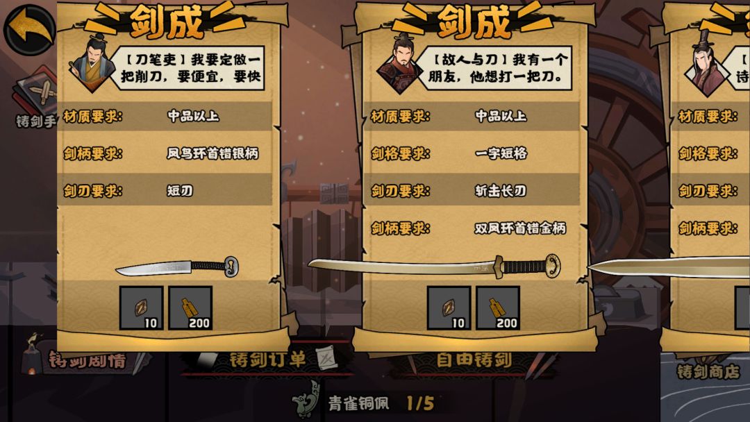 选择部件:按照订单要求,或王上的喜好,选择部件打造出合适的刀剑。在这次的铸剑活动中,新增了部分刀剑种类如“削刀”、“环首刀”、“六面长剑”等刀型。
