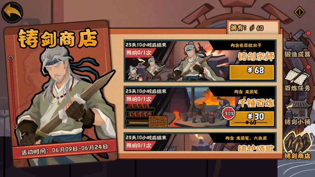 在铸剑商店可以直接购买“铸剑宗师——欧冶子”和摆件礼包,同时完成铸剑活动可获得铸币,进入商店就能兑换丰厚奖励!