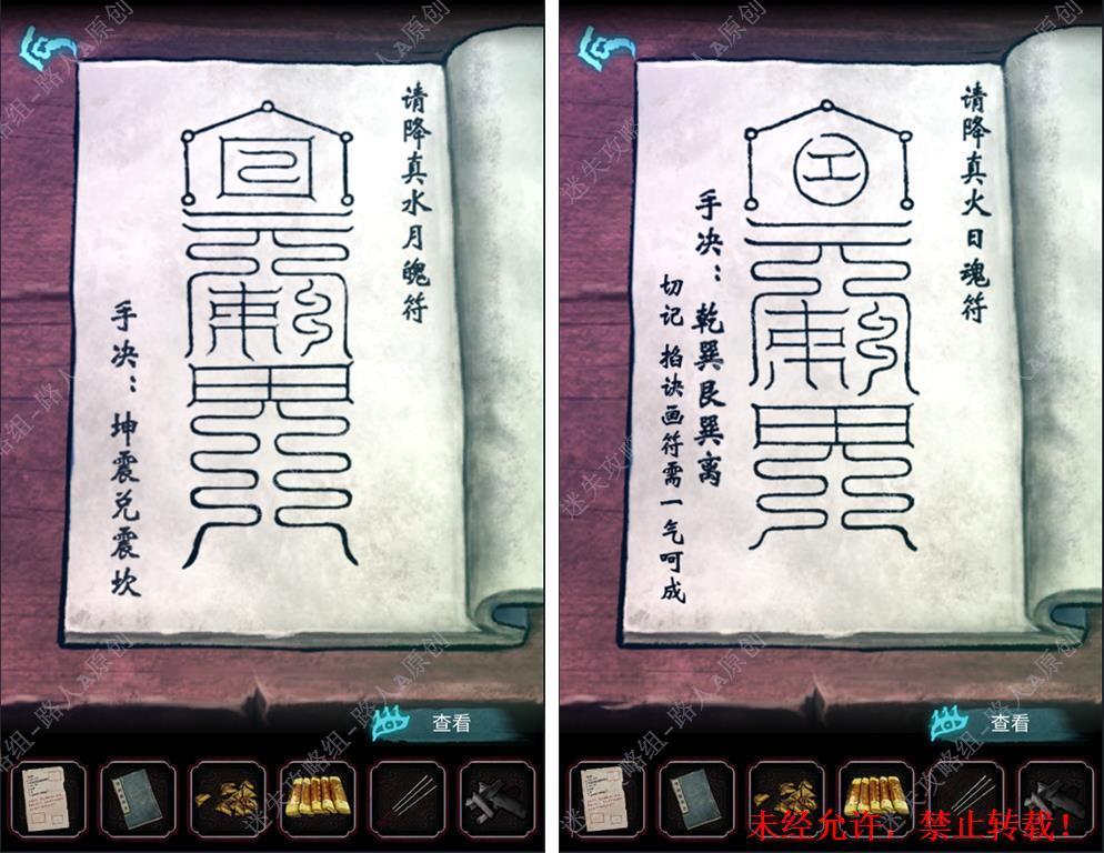 65.根据书本的线索,用毛笔沾上【朱砂】完成画符。(点击红纸画火符,点击蓝纸画水符)65.1、65.2