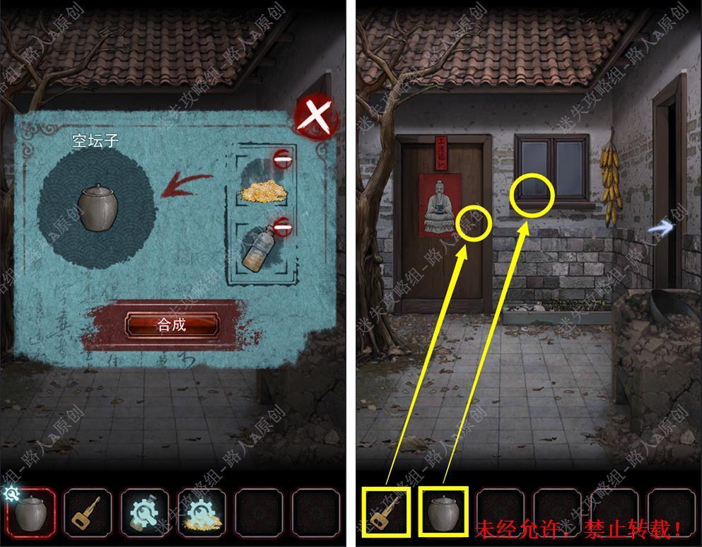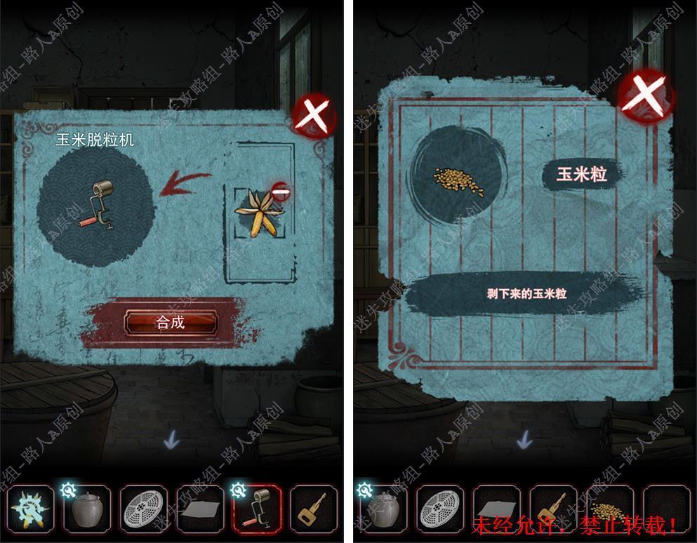 46.组合道具【空坛子】、【玉米粒】、【酒曲】,将【玉米酒坛子】放到窗台,用【钥匙】开门。46.1