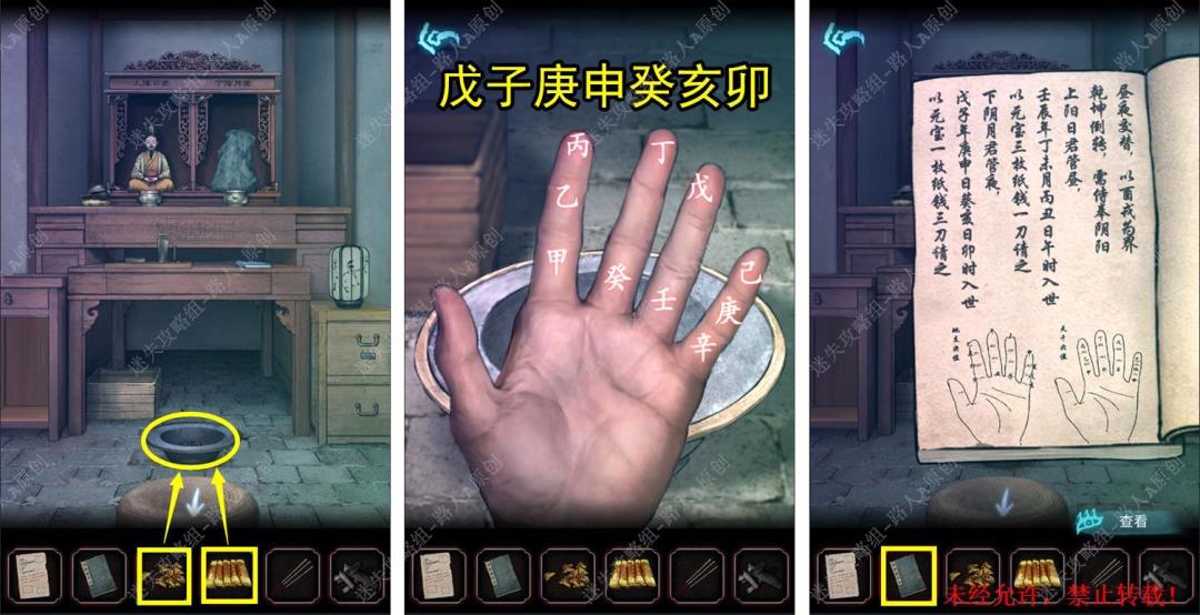 62.根据阴阳掐指诀的线索,在火盆燃烧1个【元宝】和3刀【纸钱】,掐指【戊子庚申癸亥卯】,前往下阴领域。62.1