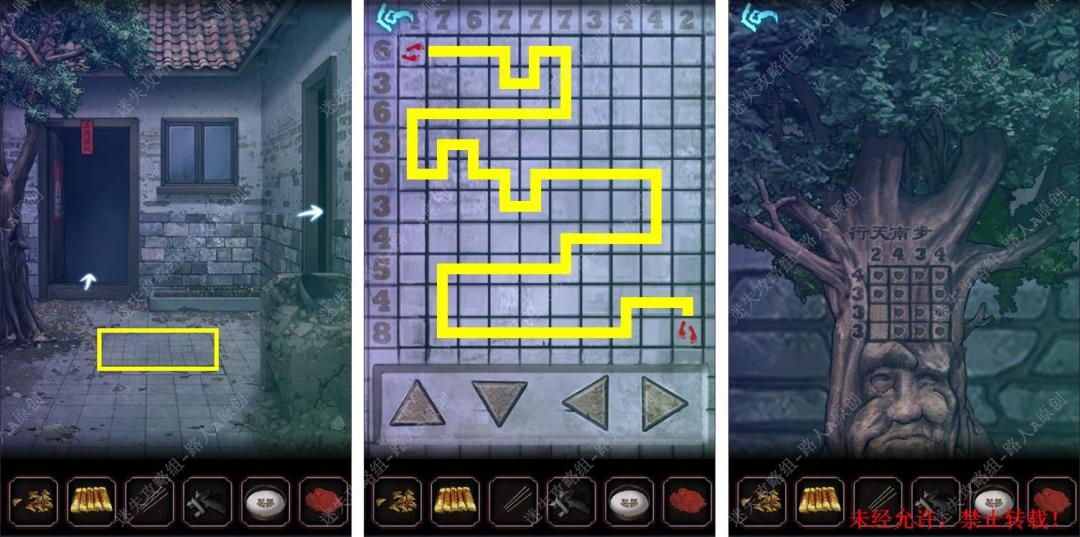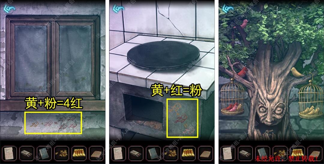 57.根据2处线索,在树上的右鸟笼放入4只黄鸟(点击树上的黄鸟),获得【钥匙】。