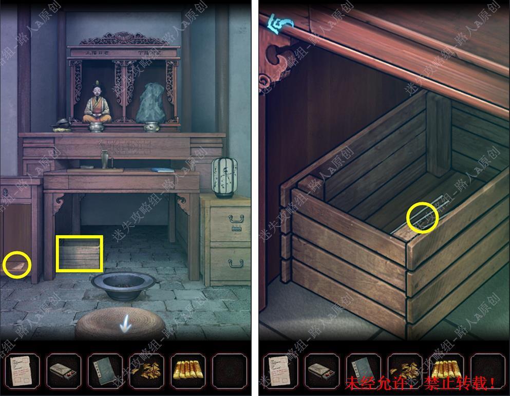 41.拾取【空坛子】、【蒸盘】、【笼布】,将【板凳】放在柜子下方,打开柜子顶部的箱子获得【钥匙】和【脱粒机】。41.1