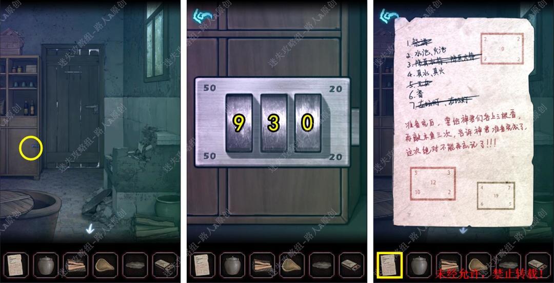51.根据仪式准备清单的线索(下面两数相乘【减去】上面两数相加【等于】中间数字),输入密码【930】打开柜子,获得【甑桶】和【天锅】。51.1
