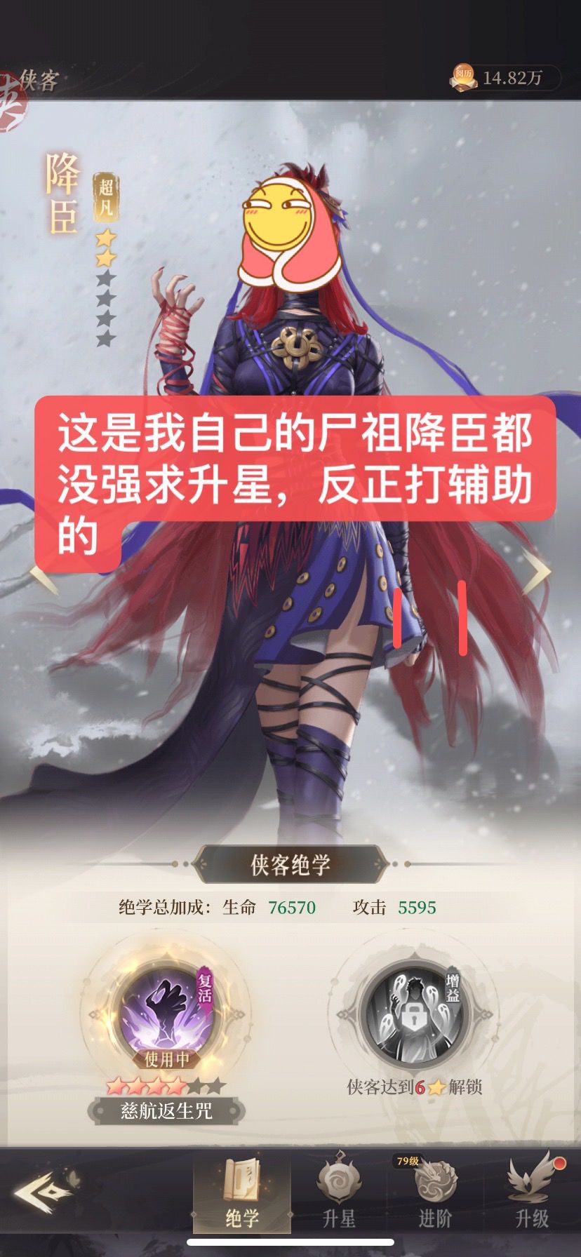 大多数人可能搞不到降臣,我是这么玩的:二星降臣搭配红色四星绝学,降臣很简单嫖看你自己,也有人从开服就攒元宝特意为了抽降臣,绝学普通四星就可以上阵容了,红色1星更好而已,没必要喷降臣很难得,五个降臣就可以开绝学四星了,记得抽降臣活动完完全全可以白嫖三个