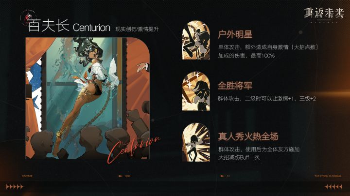 百夫长,西班牙黑皮辣妹,和红弩箭一样属于游戏中最暴力的角色之一,兽属性的输出扛把子。三个纯输出技能,核心技能户外明星,特点是自身激情越高伤害越高,这就相对比较考验玩家对战局的判断和伤害计算能力,更多的时候需要先放一技能再放大招,二技能尽量攒着升级后再打出,把激情收益最大化。在打一些高难攻坚本时,基本上大招只有在敌方准备放大的时候再用,其他时候主要靠一技能输出。
