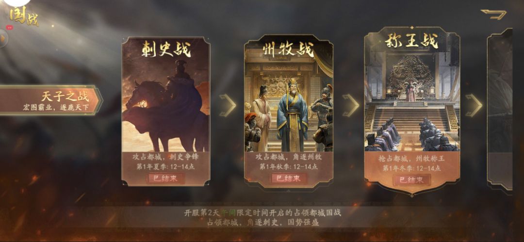 而进阶国战【州牧战】将在第一年秋季(即新服开启第3天)12-14点开启。