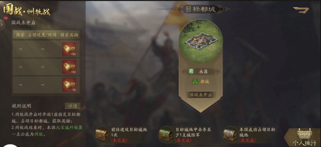 规则与州牧战相似,同样是开放本国外环1座指定都城,占领目标都城,结束时该元宝城歼敌第一主公成为州牧。