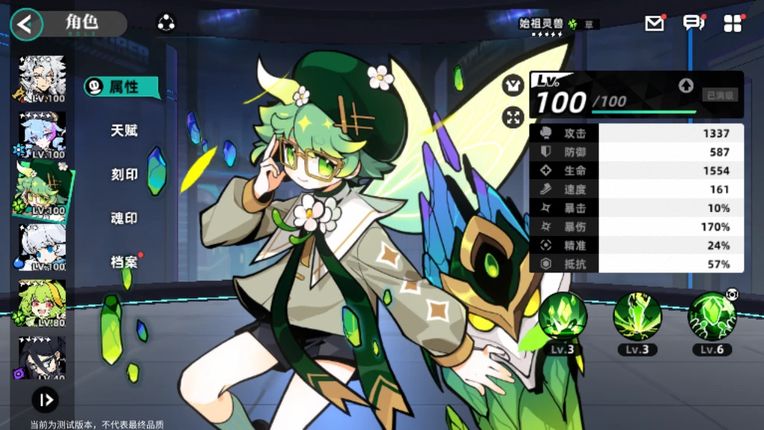 始祖灵兽5星毒奶加充能,主要的技能就是他的3技能,全体治疗加回能量,6级回复2点能量(除了自己)天赋解锁3技能后还有25%概率多回复1点能量。1技能群体伤害后回复最低生命值的角色,还有护盾。2技能群体伤害后随机一人概率中毒。魂印的1技能给护盾后,自己也有概率获得护盾和2技能使敌方中毒后,有概率给随机队友有个恢复1回合。刻印套装带虚空套或者无悔套,刻印属性选攻击、生命、防御、抵抗。这都是同行测试的数据,公测可能有所调整。