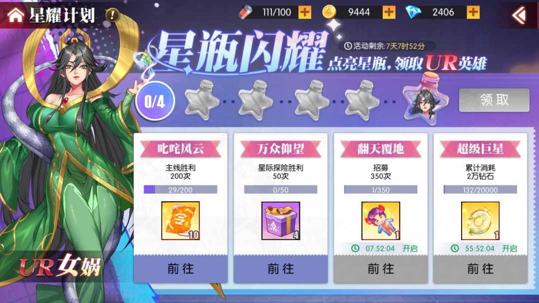 开服前7日,完成四大挑战任务即可免费领取超强UR英雄女娲,给队伍增添第一抹UR专属红色~