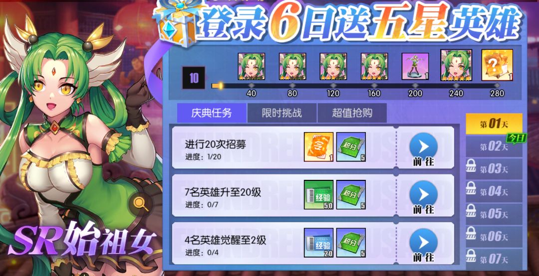 开服前7日,每天都有新的小目标,完成后不仅能快速熟悉游戏渡过新手期,更能获得各式各样的豪华奖励和超值道具哦!完成任务达指定数量, 即可领取奖励,将初始伙伴始祖女提升至UR品质!