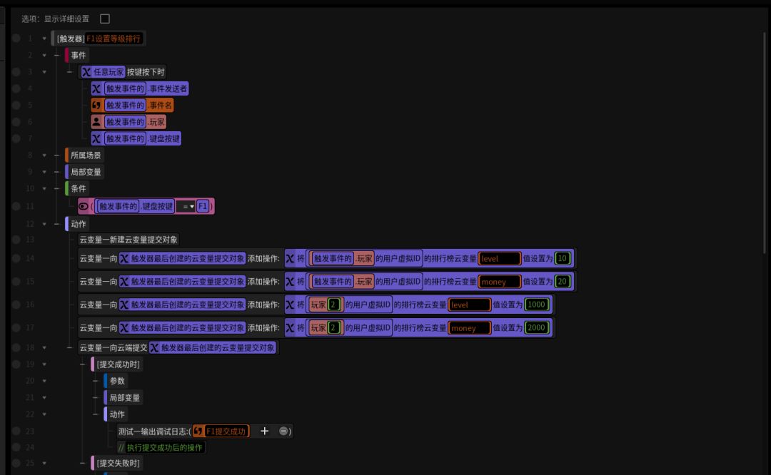第四步:开始写触发,很简单设置排行榜云变量,变量名称就是上一步写的,然后提交就行