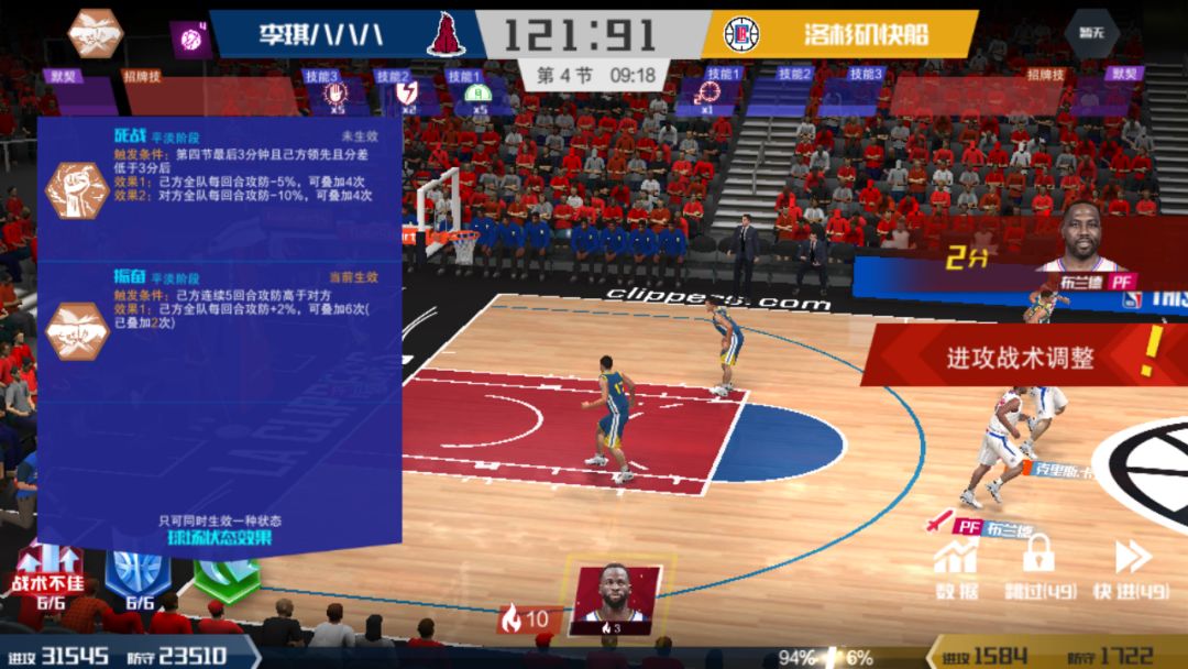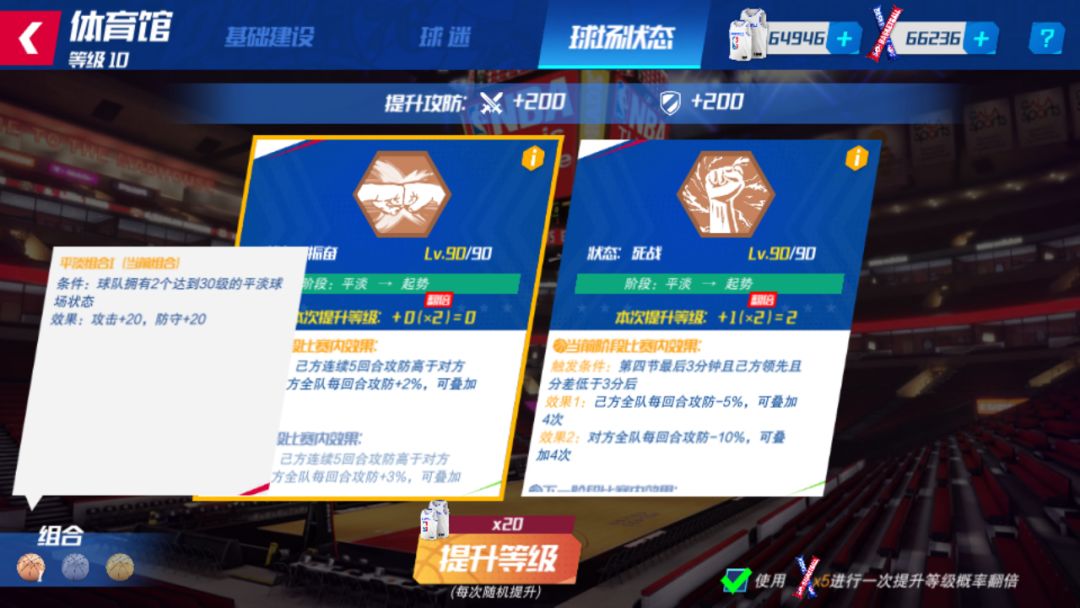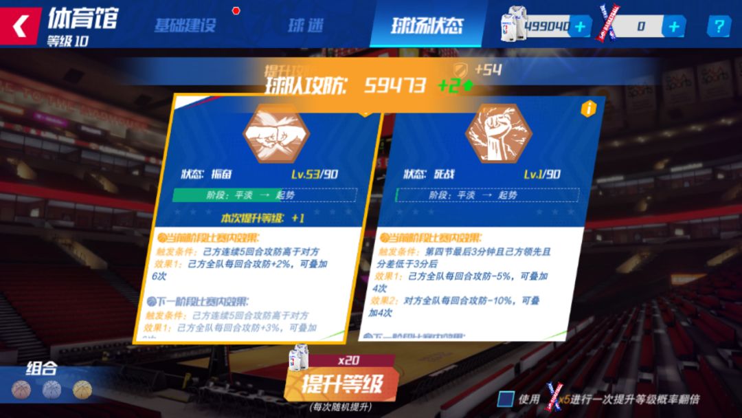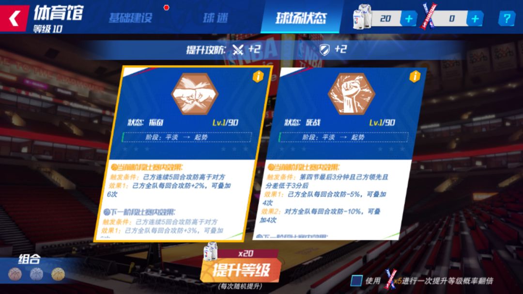 球队50级且体育馆等级3级后,体育馆开放“球场状态”。在比赛中,球队达到“球场状态”的触发条件后,将触发对应“球场状态”的效果,给球队气势、攻防、球员属性等属性提供强大助力。